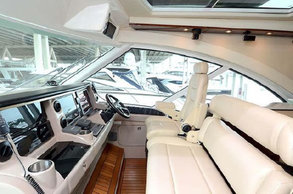 | Control Station This advanced helm comes fully equipped with Raymarine G-Series GPS/Chart plotter/Radar. Bow and Stern Thrusters, 24V Compass Emergency Start System – Engines Horn, Air – 24V Instrument Panels – High-Gloss Instrumentation: – 6.3″ Color LCD Display with Auto Dimming and Enhanced Contrast in Daylight (Includes: Engine and Gear Box Data, Graphic Presentation of Analogue Round Instruments, Display of Alarm Status and Fuel Flow) (2) – Fuel Gauges (2) Shift and Throttle Controls, Electronic Spotlight with Dual Halogen Bulbs Remote Controlled (ACR) Steering – Power Assisted with Tilt Wheel Switches, Illuminated Weatherproof Rockers and Electronic Dimmer Control Systems Monitor, Digital LCD – For Pump Monitoring. |